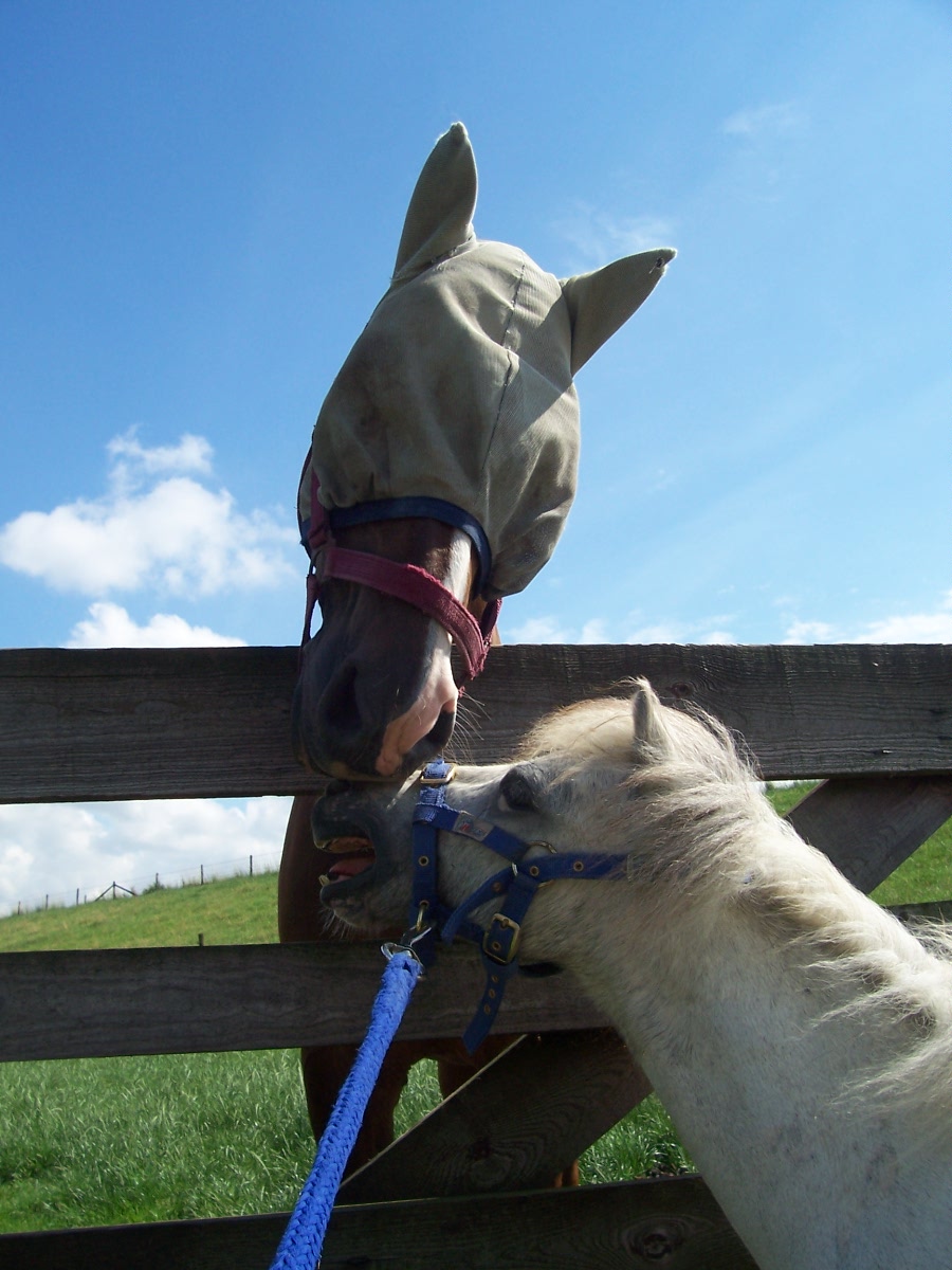 Hier maakt wobbe kennis met micky (was niet de eerste keer hoor) Micky met zijn vliegenmasker op en wobbe met zijn kleine dondersteenkoppie! |